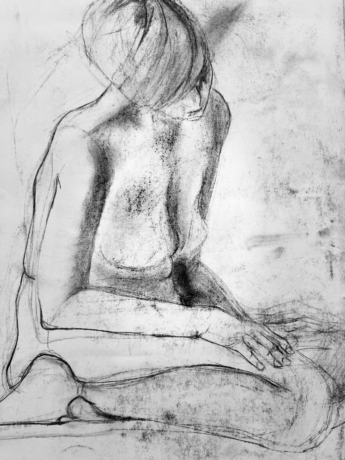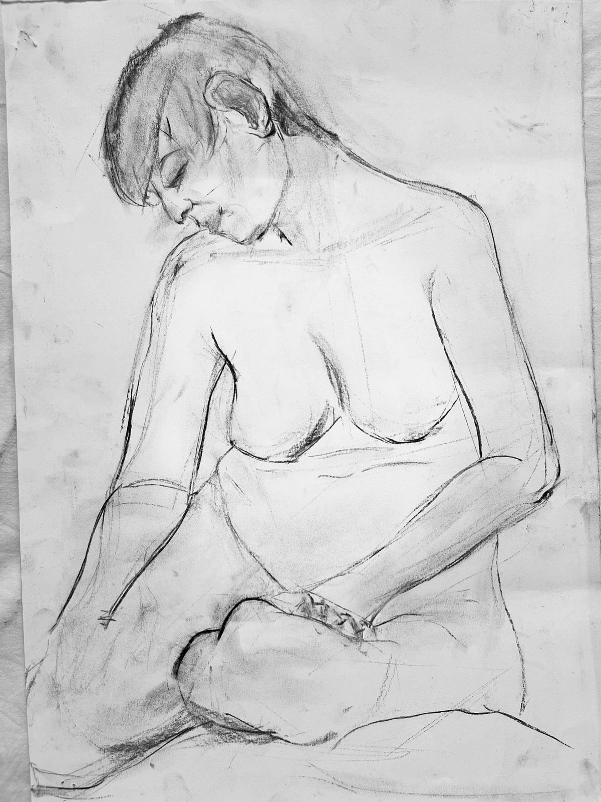 Charcoal is approached here as a responsive and immediate medium. Each line records movement, tension, and breath, allowing the portrait to emerge through gesture rather than idealisation. The drawing does not seek to polish or simplify the subject, instead it preserves nuance, subtle imbalance, and the quiet complexity of being present in a body.